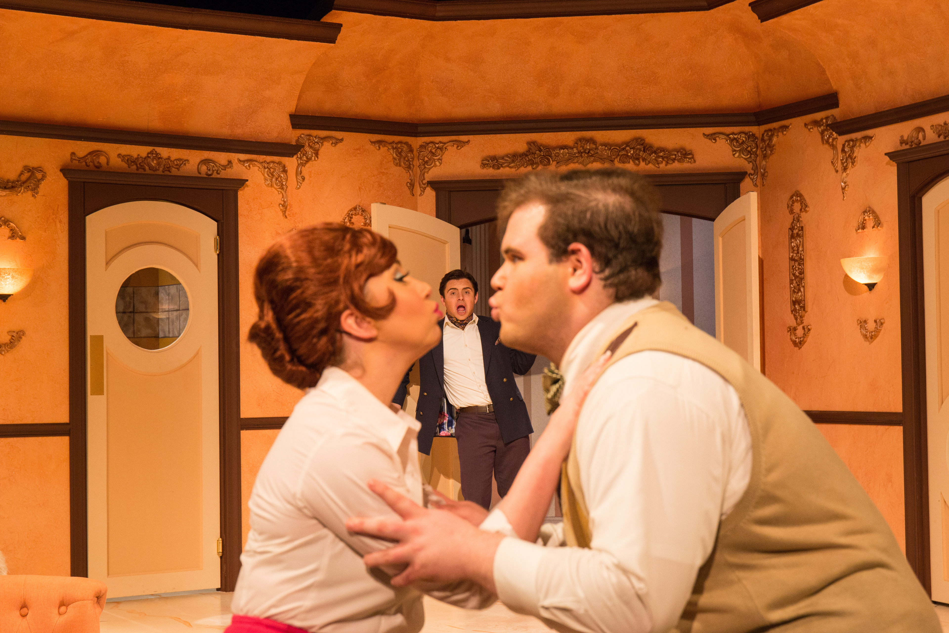 Boeing Boeing 是一個活力十足的喜劇。燈光設計以高明度呼應打亮全劇,讓演員充滿張力的表情和肢體清楚地被看見。這個經典的三幕劇在男主角Bernard的高級公寓發生,時間剛好分別是早上、下午、晚上。燈光用方向性和色溫傳達三場戲從早到晚的時間變化。第一景的早晨主要光源從演員的左前方來,並使用偏冷的白光;第二景的下午光源從演員的右前方來,使用偏暖的白光;第三景是晚上,公寓的主要照明是牆上的壁燈,並使用左右舞台的高側光補充亮度。第三景也因為劇情能量堆疊,燈光亮度最高。